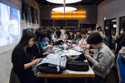 ブランドの人気アイテム デニムパンツを主役にしたイベントで、ファッション誌の編集長やモデル、アーティスト、ブロガーなどが自分らしくカスタムしたDIY作品が展示された、当イベントの初日、DIYの楽しさを直接肌で感じてもらうためにレセプションパーティが実施され、服装科とファッション流通科の2年生15名がワークショップに参加し、デニムパンツをDIYしてオリジナルの作品を制作しました。