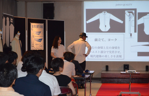 最終プレゼンテーションでは、各チームで考えた「日本製」の解析と、テーマに合わせて製作した、オリジナルシャツのデザイン説明、モデル着装によるシャツの発表を行いました。