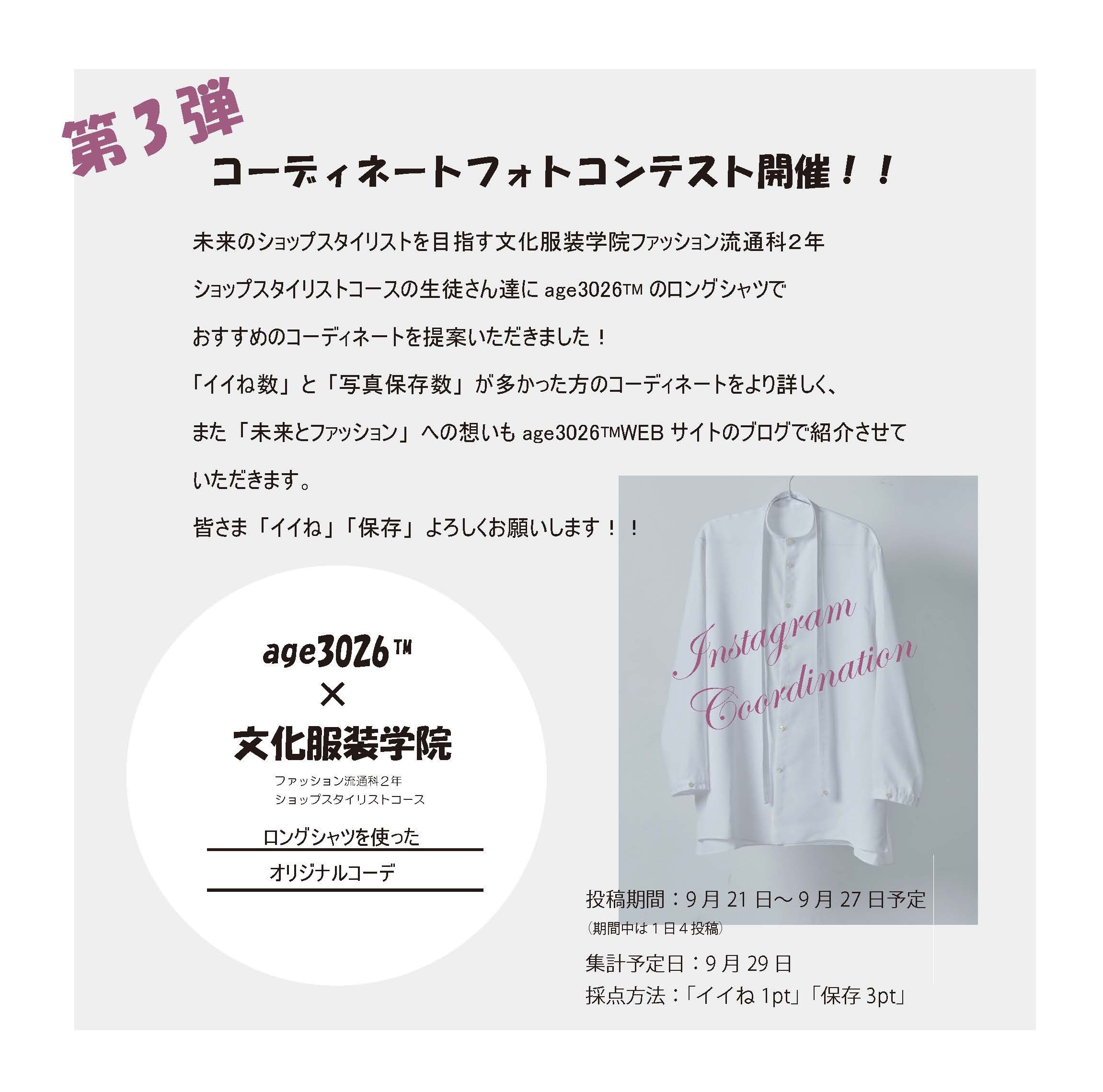 ファッション流通科2年ショップスタイリストコースの学生が三菱ケミカル(株)が手掛ける繊維「ソアロン™」の公式アパレルブランド「age3026™」のロングシャツを使ってコーディネートを提案しました。9月21日よりage3026™のインスタグラムにて1日4人のコーディネートが投稿され9月27日まで毎日アップされる予定です。その後イイね数と保存数の多かった方はWEBサイトにて紹介されます。ぜひ、age3026™のインスタグラムをチェックしてください。