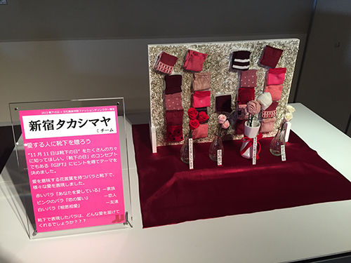 日本のレッグウェアを生産する多くのメーカーが加盟する日本靴下協会では11 月11 日を靴下が2足並んで見える日付から「くつしたの日」と制定し、”大切な人に靴下を贈る日にしよう” という呼びかけをおこなっています。昨年に引き続き、「くつしたの日」に開催されたキャンペーンイベント内でファッション流通専攻科ファッションディレクター専攻の学生が来場者向けにギフト需要を掘り起こすためのヒントやアイデアを提案する展示を行いました。今年は新宿髙島屋、小田急百貨店新宿店、東武百貨店船橋店の実際の売り場を想定した店頭ディスプレイ企画を全7チームに分かれ、各店舗のご担当者様にプレゼンし、選抜されたチームは実店舗での店頭ディスプレイに採用されました。