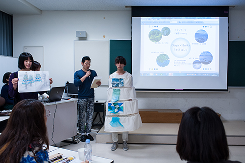 11月 岡谷シルクの特性を活かした作品プレゼンテーションを実施。岡谷市関係者の皆様や業界で活躍されている卒業生のデザイナー野中厚志さん(spologum)らに講評を頂きました。