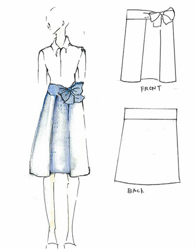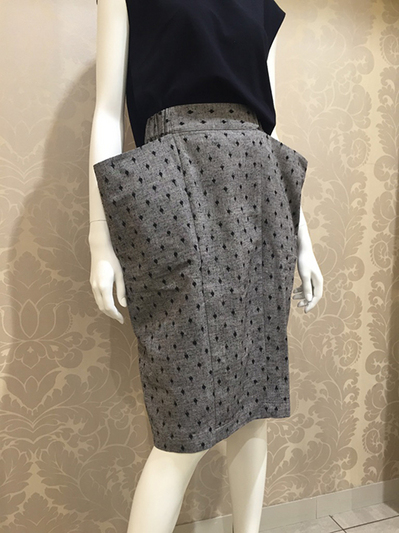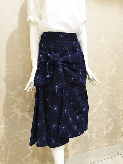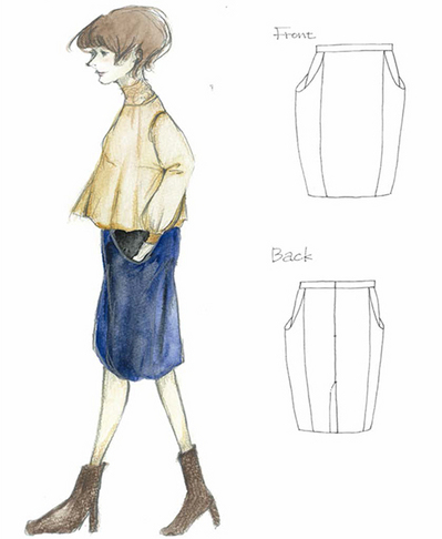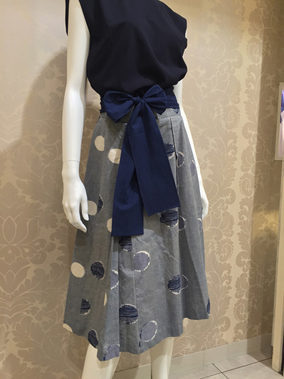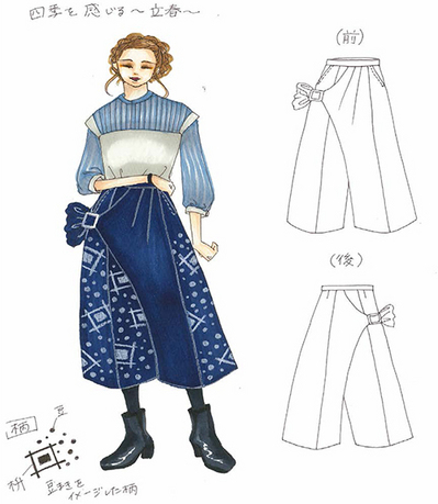 「オシャレに着れる久留米絣」をコンセプトにセミタイトなスカートを提案します。大きめのポケット、縦に入った切替えなどで体型をカバーできるように考えました。