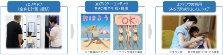 文化祭では、「アパレルとテクノロジーの未来を切り開く」をテーマにコラボレーションを展開します。参加者は自身を3Dスキャンし、わずか数十秒ですぐに自分フォトリアルアバターをスマホで入手できます。さらに、TOPPANホールディングスと共同開発したアプリを起動することで、LINE やInstagramなどのSNSで使用できるスタンプ風動画を入手できます。 今回の体験は、Z世代を中心に、バーチャルファッションに興味を持つ若い世代を魅了し、ファッションとテクノロジーの可能性に触れさせることを目指しています。また、学生だけではなくアパレル業界の方々にも体験していただくことで、バーチャルファッション市場を促進することを期待しております。