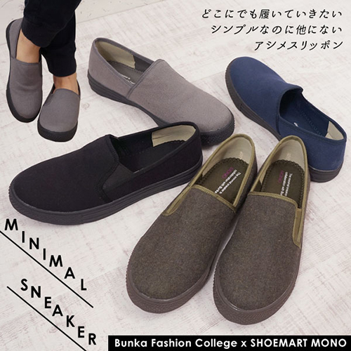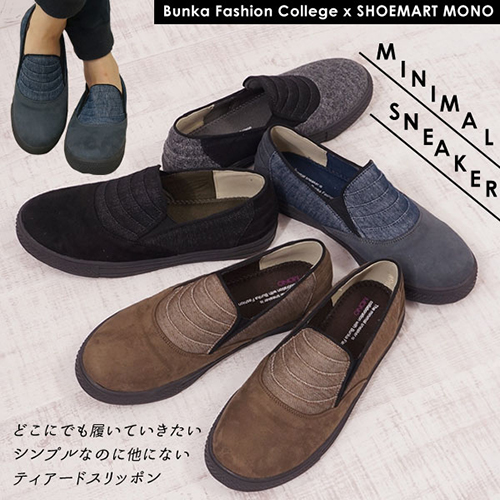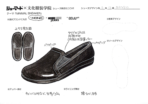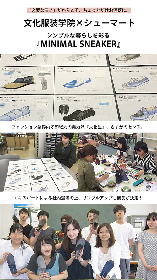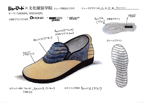 長野・群馬・山梨・新潟・茨城などに靴専門店をチェーン展開する株式会社シューマートと文化服装学院シューズデザイン科との商品化コラボレーション企画を実施しました。シンプルな暮らしを彩る『MINIMAL SNEAKER』をテーマにスリッポンのオリジナルデザインの募集を行い、2名の学生のデザインが採用されました。