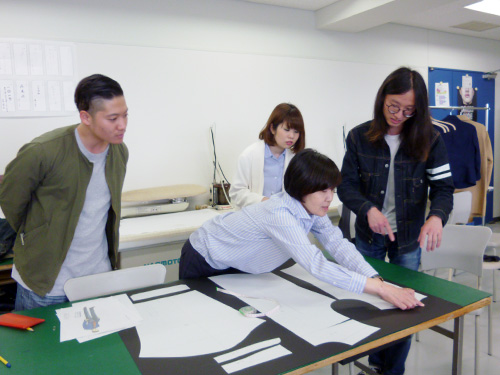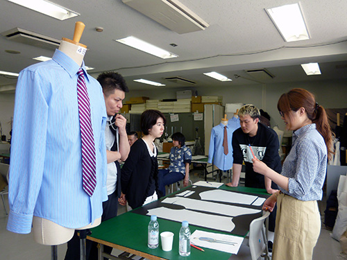 ワイシャツをメインとしたアパレルメーカーのフレックスジャパン株式会社と文化服装学院ファッション工科専門課程アパレルデザイン科メンズデザインコースのコラボレーション授業「シャツ講座」。