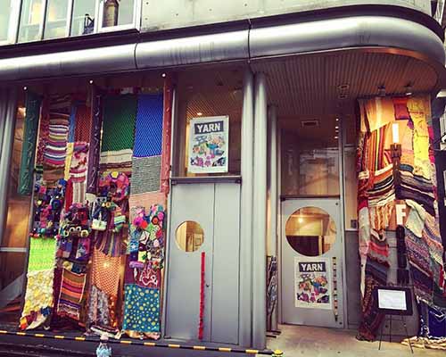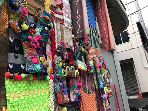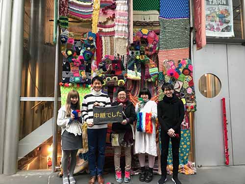 203gow氏の作品とワークショップ参加者の作品、そして学生たちの編みあげた巨大編み地を組み合わせ装飾された渋谷シアター・イメージフォーラム