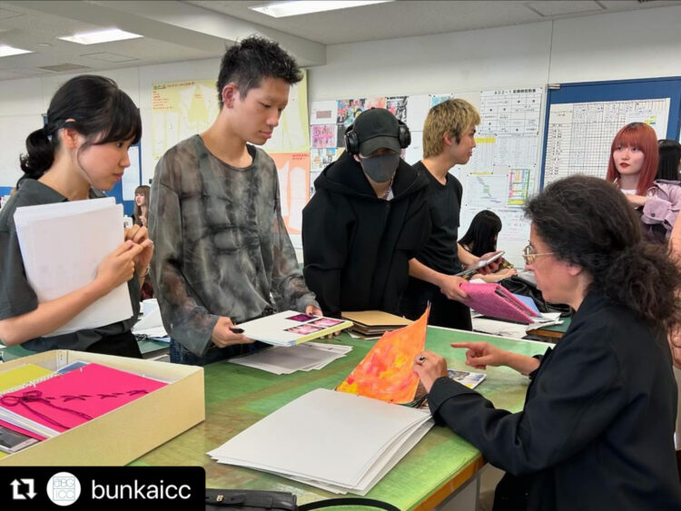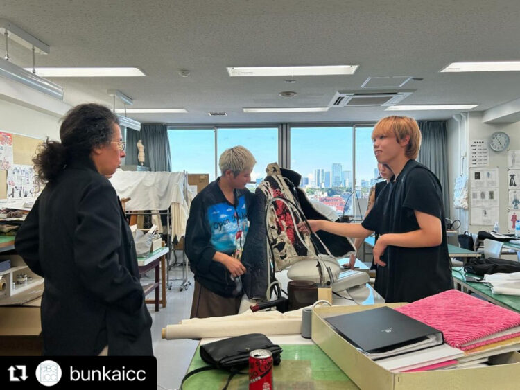 当日は施設の見学と、アパレルデザイン科2年生の学生たちの作品に一人ひとりアドバイスをしてくれました。