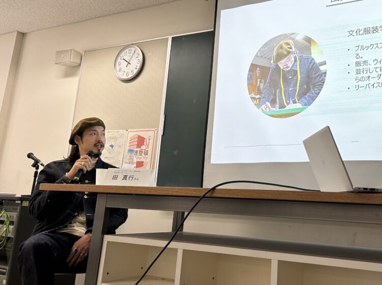 世界で6人しかいないリーバイス®のマスターテーラーの1人、田 真行さん(服装科卒)をお迎えし、ファッション高度専門士科3年の学生に向けて特別講義を実施いただきました。リーバイス®のテーラーショップに関することや田さんのテーラーとしてのキャリアについて、自身のご経験をまじえながらお話しいただきました。