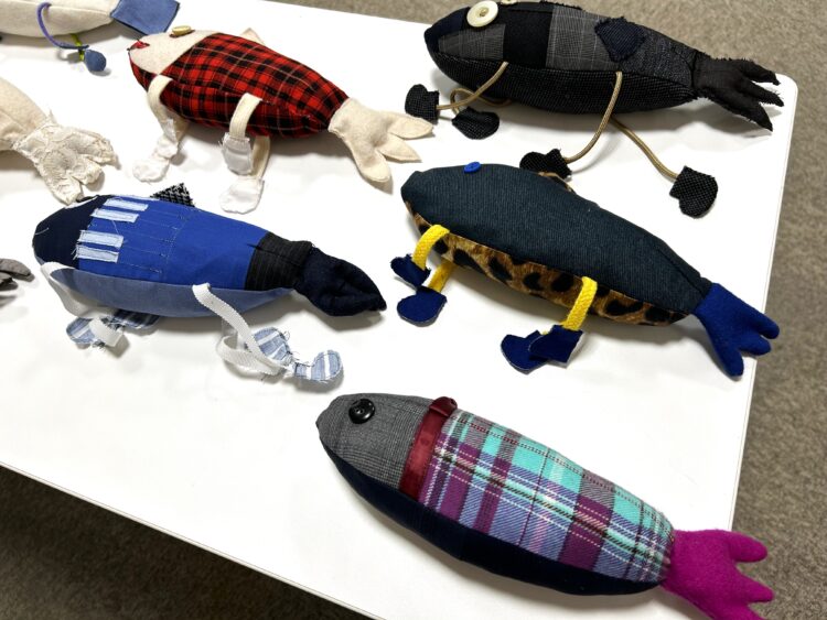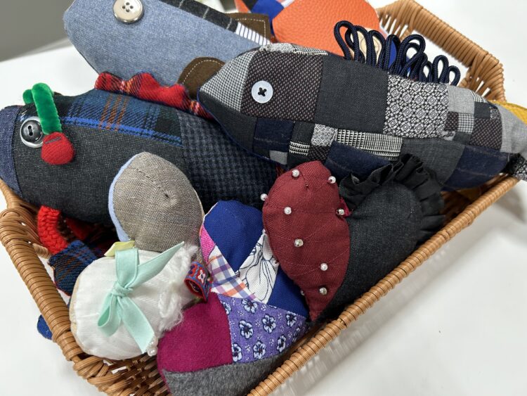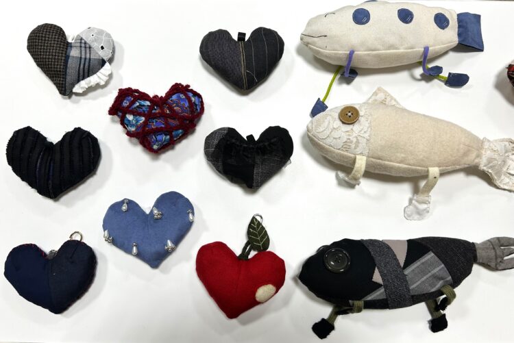 2021年度から継続して実施されている本プロジェクト。今年は猫のおもちゃと、ハート型の装飾チャームを制作しました。作品の材料には、SARTOサロンで出た布の端材や、学生が作品に使用した布の残布を使用しており、環境にも配慮しながら制作されました。
