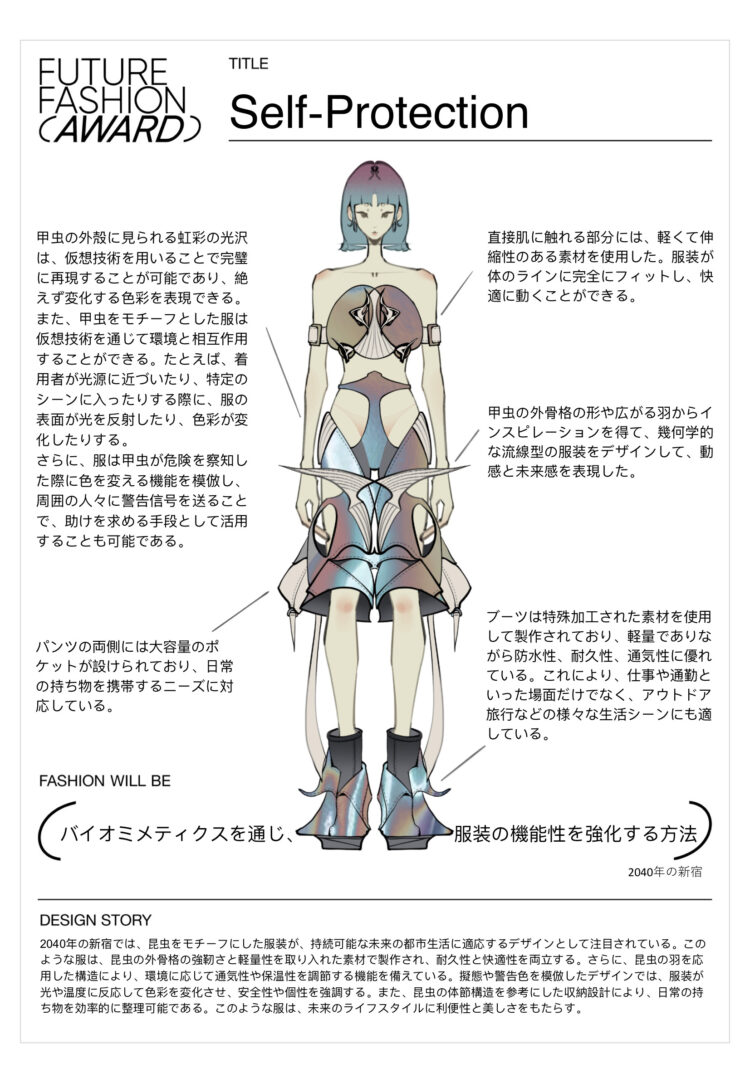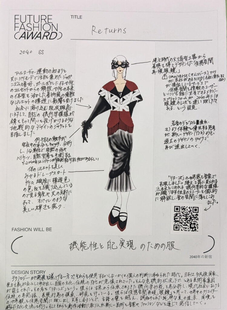 三越伊勢丹よりファッションを取り巻く社会・環境の変化やデジタルファッションについて全4回の講義を行い、「2040年の未来の新宿の街」をテーマにデザイン画を制作・コンペティションを開催。提出作品から選出された下記の優秀作品2点が、三越伊勢丹が運営するメタバースアプリ「REV WORLDS」でアバター衣装として販売が開始しました!