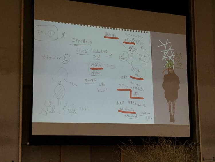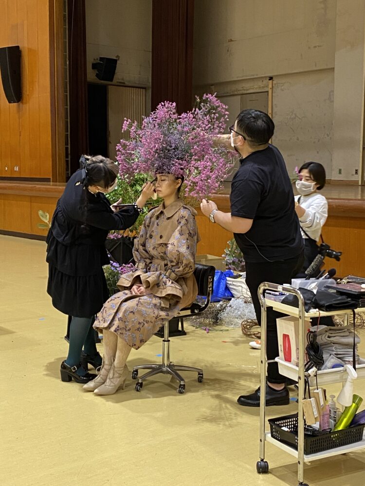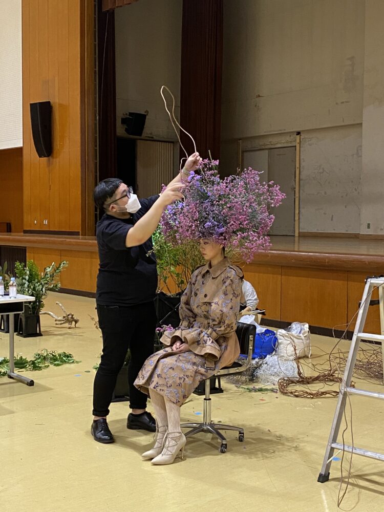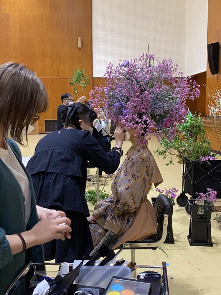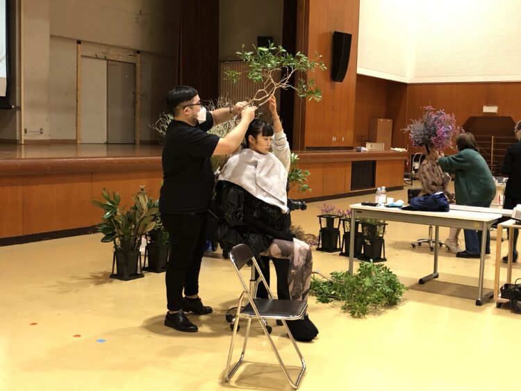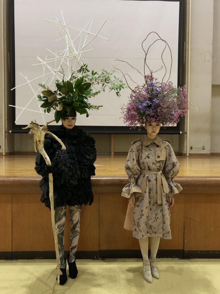 授業前半ではいけばなに関する基礎知識やいけばなを用いた現代アートについての講義、後半では学生が制作した衣装2点とのコラボ装花を実演していただきました。2点の衣装それぞれのテーマに合わせて、テクニックを駆使しながらいけばなで彩っていく様は圧巻でした。