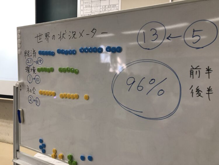 前半はゴール達成に向けて邁進するグループが多く、経済は飛躍的に発展したものの環境と社会は壊滅的という結果に(写真「世界の状況メーター」-1を参照」)。この結果を全員で検証し、対話を重ねた後半は、グループ同士で足りないもの・欲しいものを融通しあうことが増え、環境と社会にも配慮しながら経済発展も手にするという、調和のとれた世界の実現を叶えました(写真「世界の状況メーター」-2を参照)。