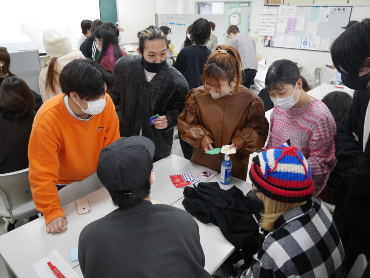ゲームはカードを交換していくという特性上、教室内は活気にあふれ、学年を越えたコミュニケーションが生まれていましたが、これは現実社会でも相手の話に耳を傾け、話し合いを重ねる中でよりより世界を目指すことと重なるよう。SDGsについて学ぶ機会の多いファッション流通高度専門士科の学生たちにとっても、さらなる行動変容がもたらされることを予感させる、貴重な機会となりました。