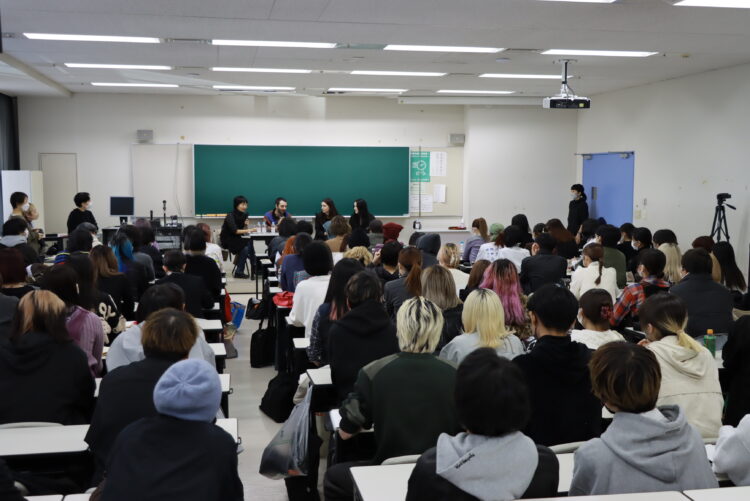 午前中はアパレルデザイン科3年生と希望する2年生を対象に、午後はシューズデザイン科の学生に向けて講義を実施。午前中の授業では、2時間にわたりデザイナー志望の学生たちからの質問が途絶えず。授業終了後も、直接話を聞き挨拶をしたい学生たちが3人を取り囲んでいました。
