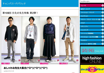 文化出版局の装苑 ファッション・ポータルサイトfashionjp.net内ファッション・クリップのコーナーにファッション・スナップ「キャンパス・パパラッチ」が登場しました。今、雑誌でもウェブでもストリート・ファッション花盛りですが、日本というよりもアジアの中で最も個性的で最先端をいくファッションを見られるのが文化学園のキャンパス。それは、原宿よりも渋谷よりも,どこよりも興味津々です。そんな文化生のファッションを4人ずつ紹介していきます。撮影も取材も全て文化服装学院ファッションメディア専攻の学生が担当し、ユニークなファッションリポートを掲載しています。