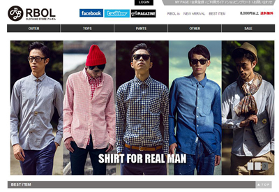 オリジナルブランド「RBOL」を中心に海外商品もセレクト、最新の注目メンズファッションアイテム紹介や、低価格でのスタイリング提案、一つのスタイルに捉われず、こだわりのアイテムをクリエイティブに提案。