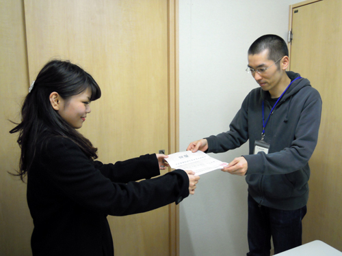 11月19日(月)、教員2名と学生代表としてアパレル技術科生産システムコース飯山智奈美さんが、福島県いわき市 高久第10応急仮設住宅 楢葉町サポートセンターを訪問。 飯山さんが主体となって目録の贈呈とプロジェクトの報告を行い、現地担当者の方には、たいへん喜んでいただきました。