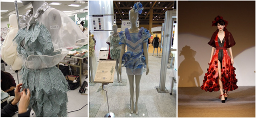 左から”オリジナル作品の制作風景”、”IFF(合同展示会)での作品展示”、”IFFTI(国際ファッション工科大学連盟)年次総会会期中にショー形式で発表した作品”