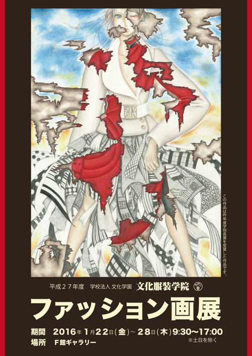 「2015年度ファッション画展のお知らせ」 【期間】平成28年1月22日(金)~28日(木)*土日を除く 【時間】9:30~17:00 【会場】文化服装学院F館ギャラリー*入場無料 ファッション画展ではファッションデザイン画の授業にて描かれた表現豊かな 優秀作品約250点を展示しております。期間中会場では、22日・25日の2日間 来場者による人気投票を行います。ぜひあなたのお気に入りを探しに来てください。