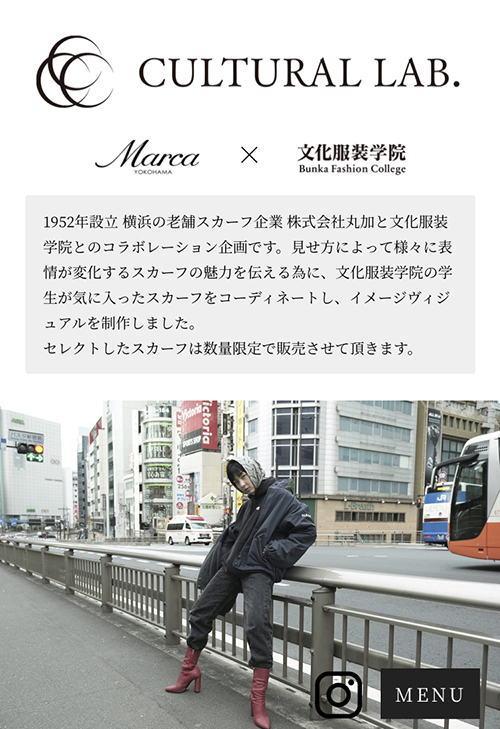 見せ方によって様々に表情が変化するスカーフの魅力を伝える為に、文化服装学院の学生が気に入ったスカーフをコーディネートし、イメージヴィジュアルを制作しました。セレクトしたスカーフは数量限定で販売します。