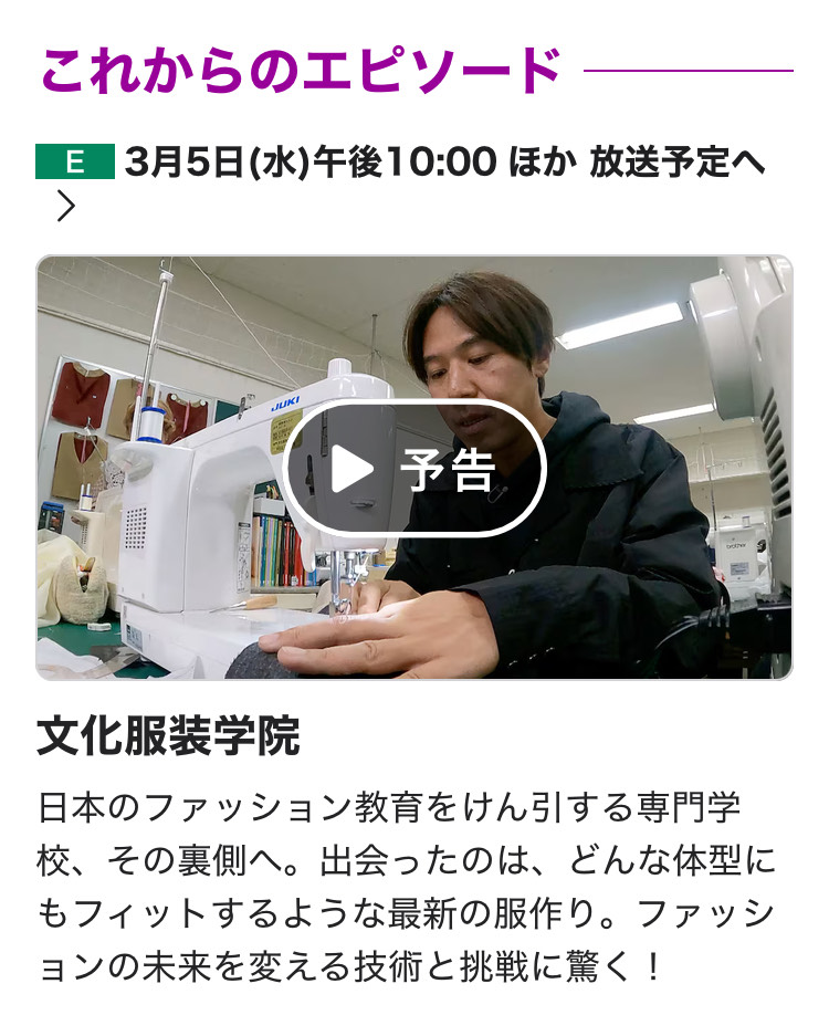 内容 日本のファッション教育をけん引する専門学校、その裏側へ。出会ったのは、どんな体型にもフィットするような最新の服作り。ファッションの未来を変える技術と挑戦に驚く!