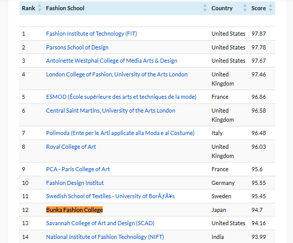 日本国内のファッションスクール(服飾系大学・美術大学関連学部・専門学校)では唯一ランキングの中に入っており、最も高い評価を頂きました。