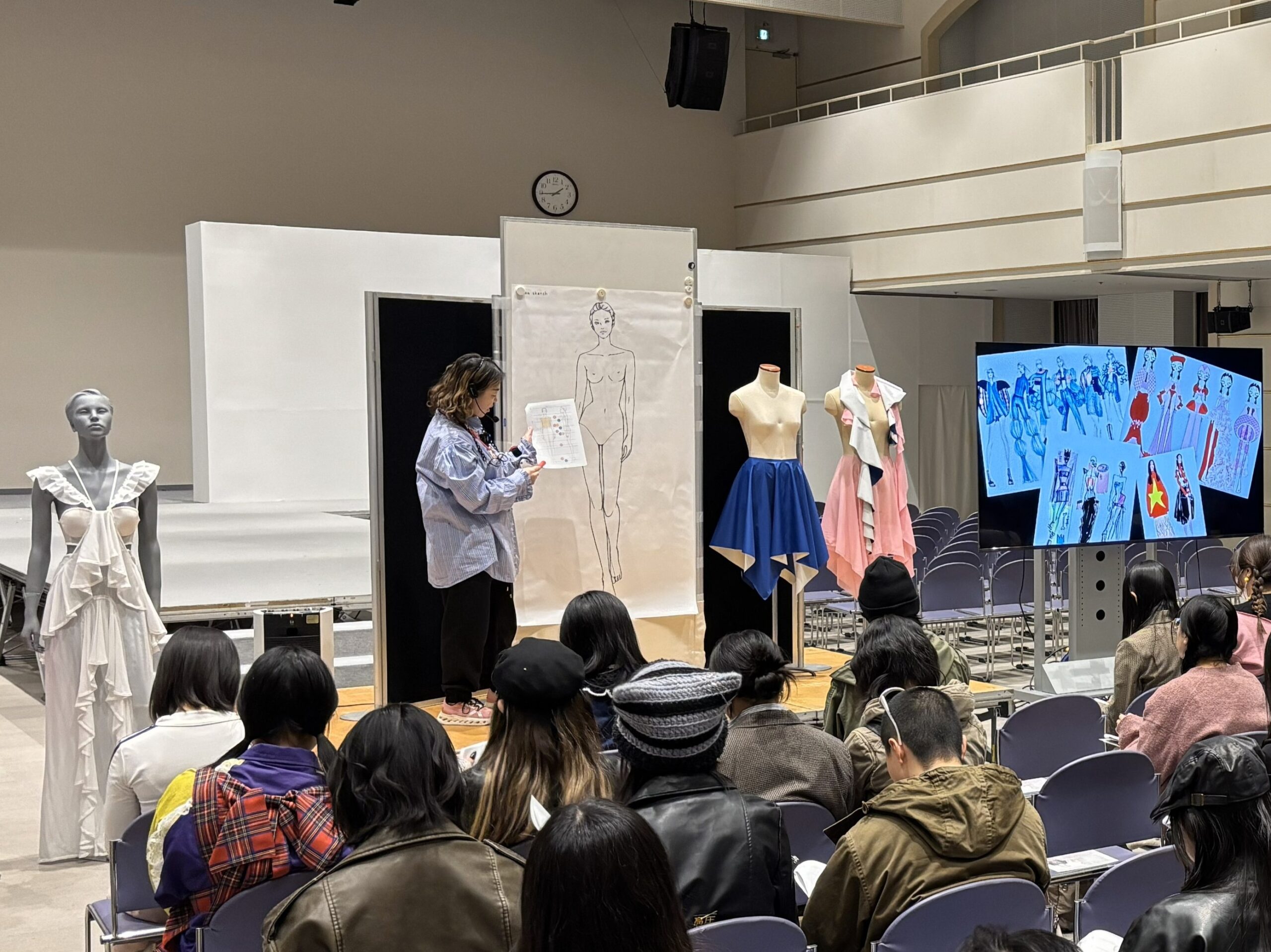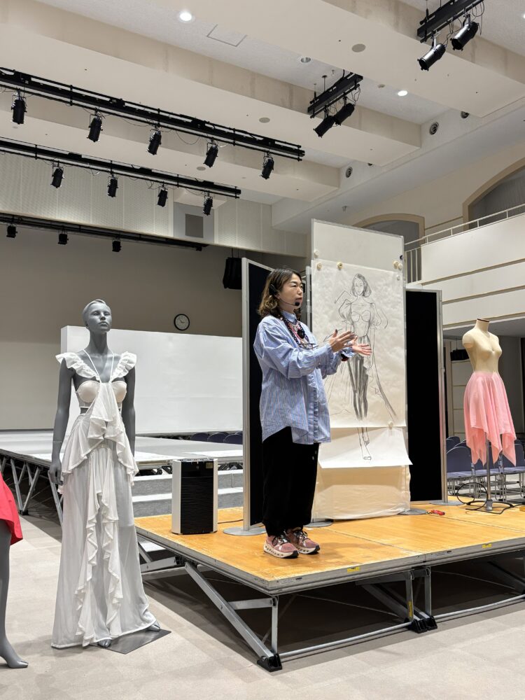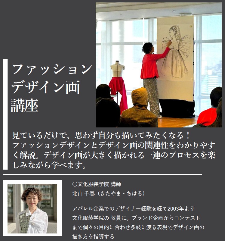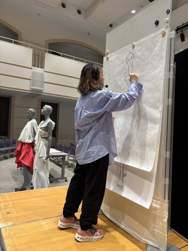 第1弾となる『ファッションデザイン画講座』には全国各地から多くの入学予定者が来校。デザインの解説や、大きく描かれたデザイン画が印象的な、臨場感あふれるセミナーとなりました。