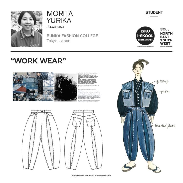 日本代表として選抜された、服飾専攻科技術専攻の森田百合香さん(選考当時は服装科2年)は日本の伝統的な衣装からインスピレーションを得たジーンズをデザインし、WebセミナーやISKO JAPANのサポートを受けながら作品を制作。オンラインでのプレゼンテーション審査の結果、パターン力と最適な生地のチョイスが評価され、20名の各国選抜代表者の中から森田さんの作品が見事“BEST 5 POCKET