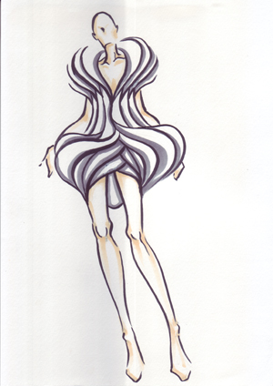 課題のデザイン画に基づき、トワルを使って作品を制作します。デザイン画を具現化するイメージ力と構成技術を競うコンテストです。