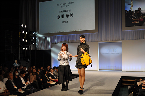 DSC0955.jpg2015年10月8日に両国・国技館にて第15回YKKファスニングアワード授賞式が開催されました。5,889点の中から選ばれた入選作品28点(アパレル部門18点、ファッショングッズ部門10点)が披露され、バッグデザイン科の在校生が見事、ファッショングッズ部門でグランプリを獲得しました!!!