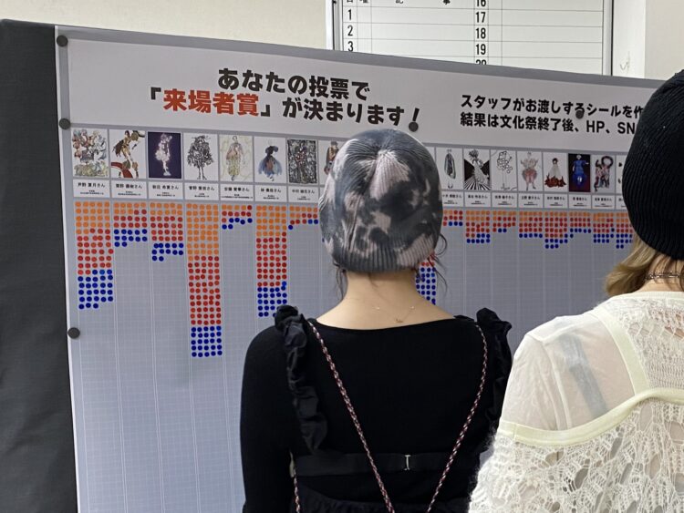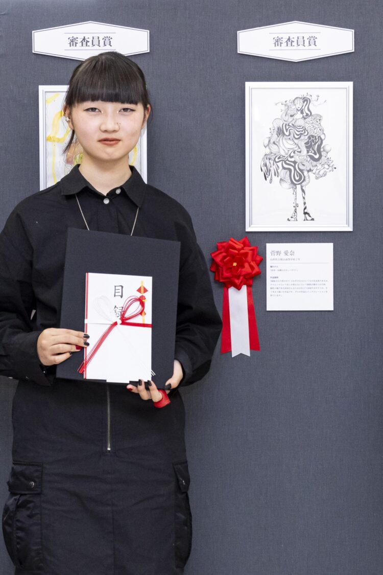 また、文化祭展示期間中に来場いただいた方の投票により、【来場者賞】が決定。総得票数1157票のうち最多の120票を集め、見事【来場者賞】に輝いたのは菅野 愛奈さん(山形県・惺山高等学校 2年)の作品です。菅野さんは審査員賞とのダブル受賞となり、今後の活躍が期待される若きクリエーターという栄誉を得ました。