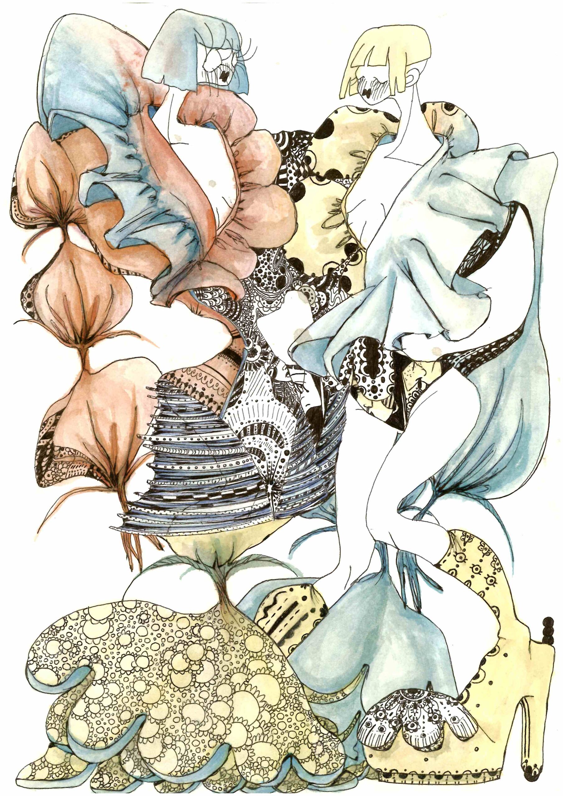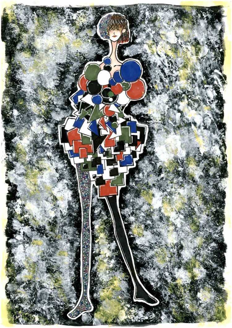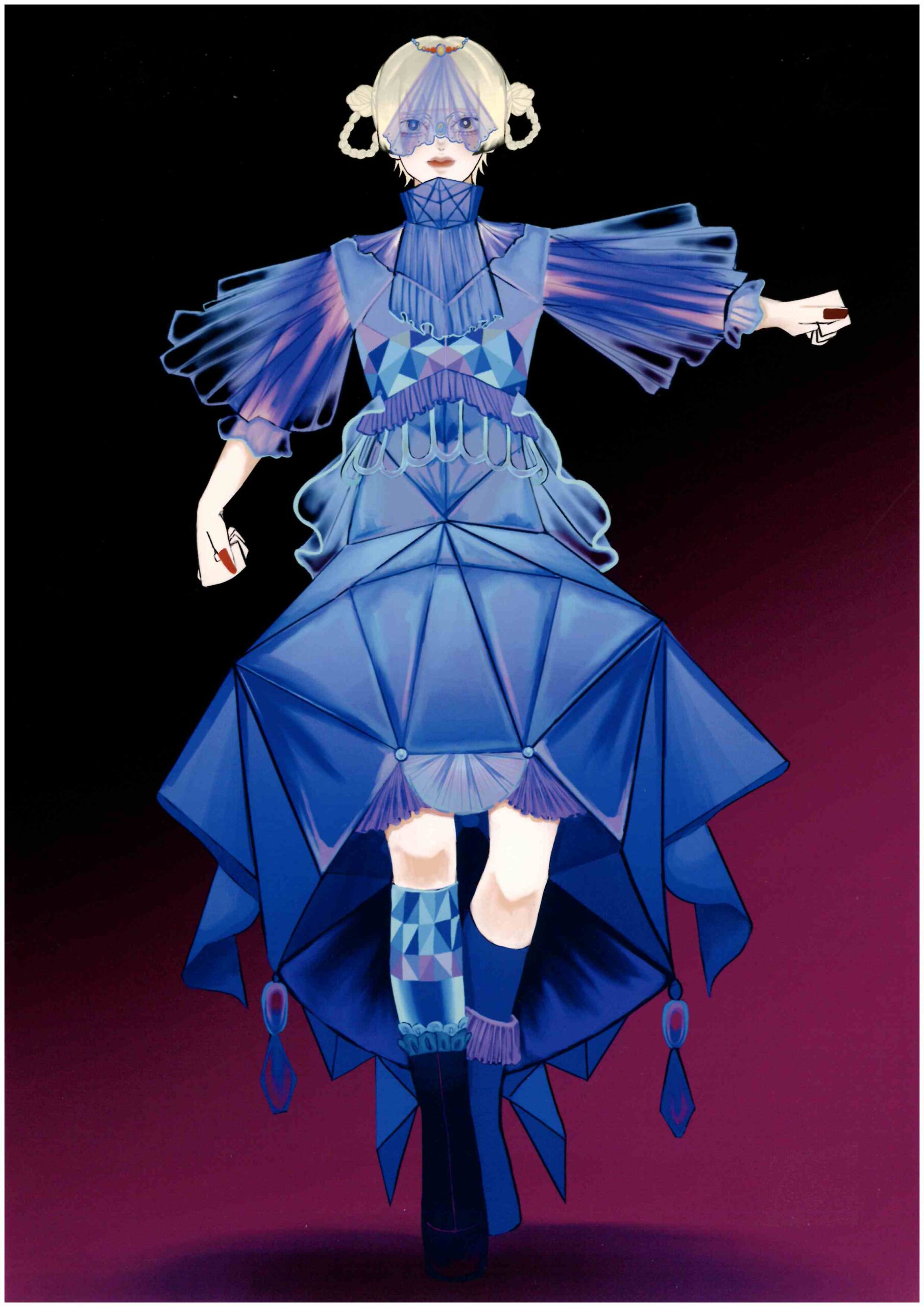 選評「通常、1体分のデザイン画を描く方が多い中、2体での表現に挑戦された意欲的な作品として目をひきます。全体的な構図、ダイナミックなボディバランスのめりはり、淡い色合いのタッチなど高校生とは思えない表現力を感じました。服のデザイン力も突出しており、デザイン画大賞といたしました」
