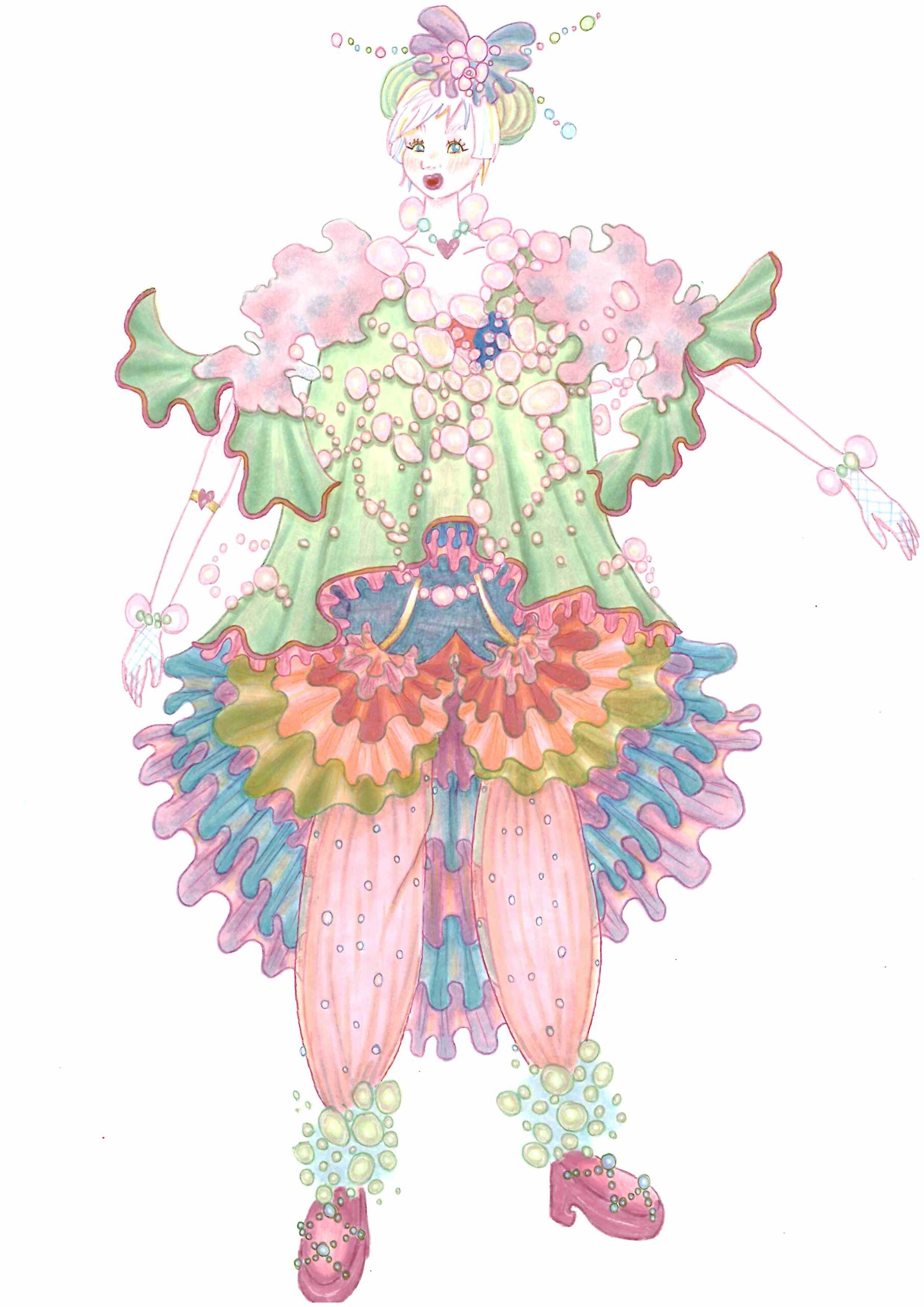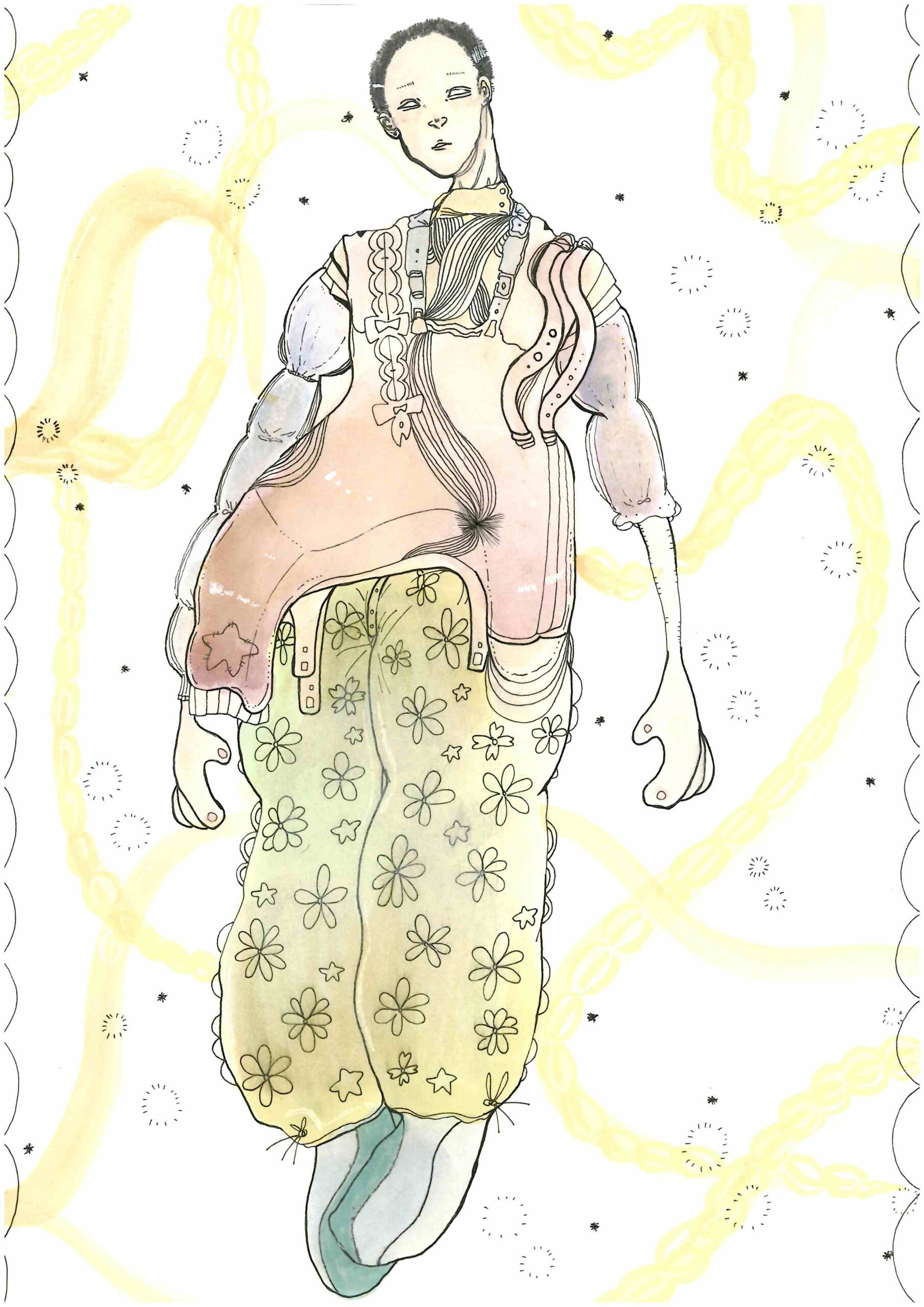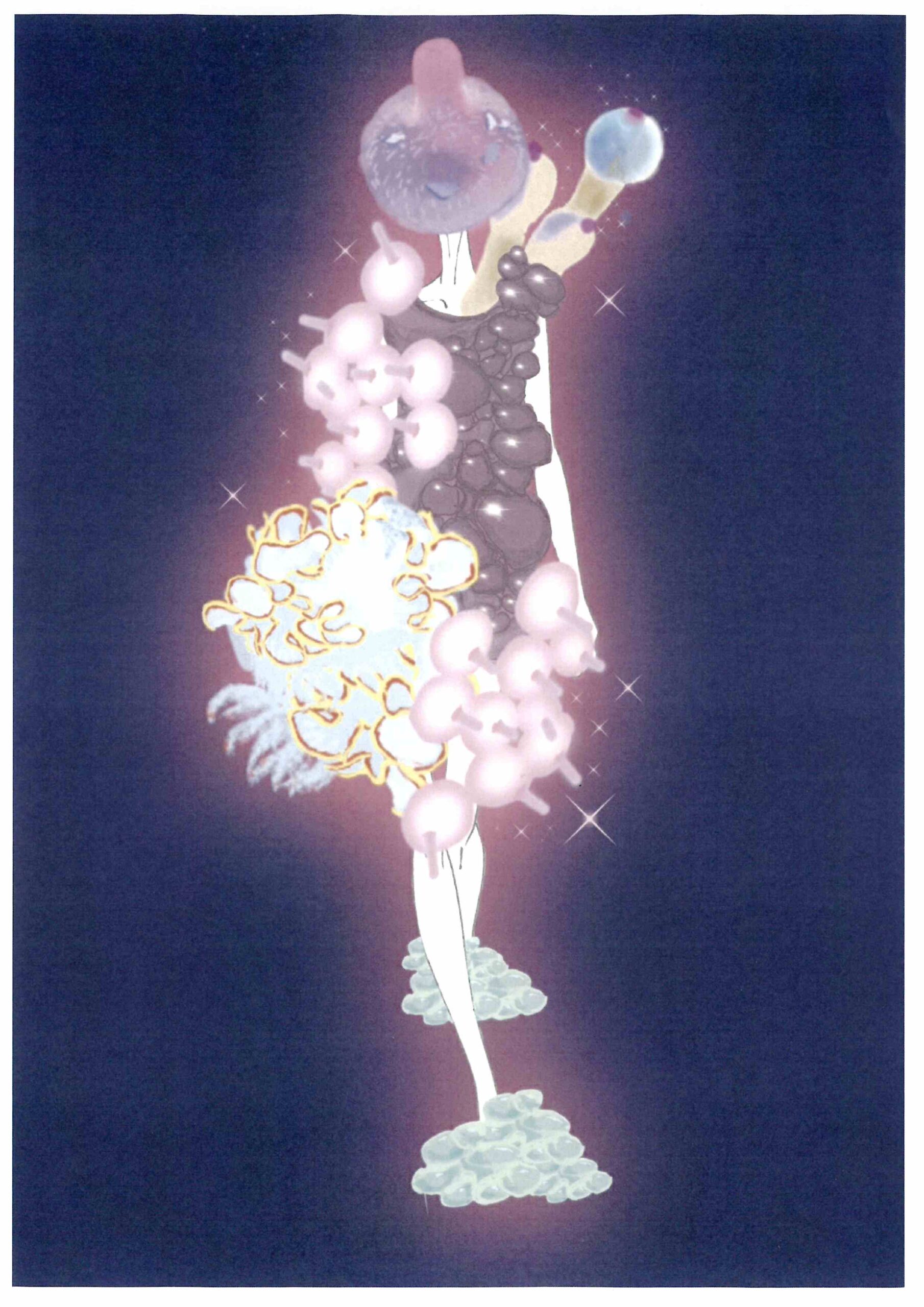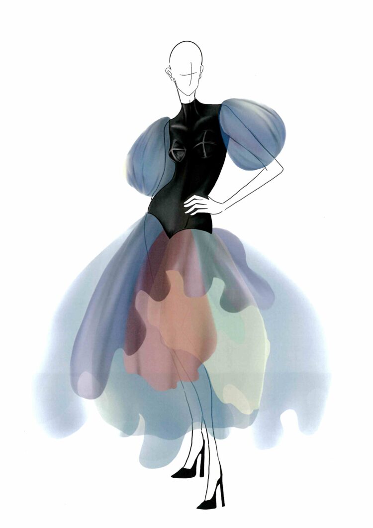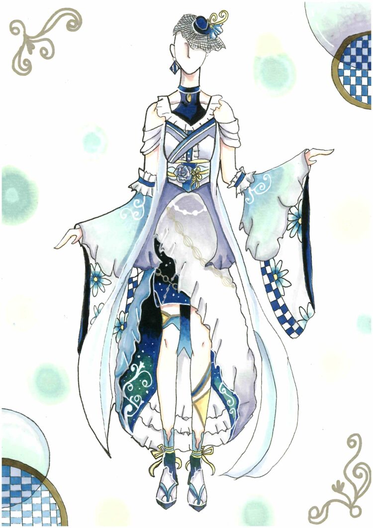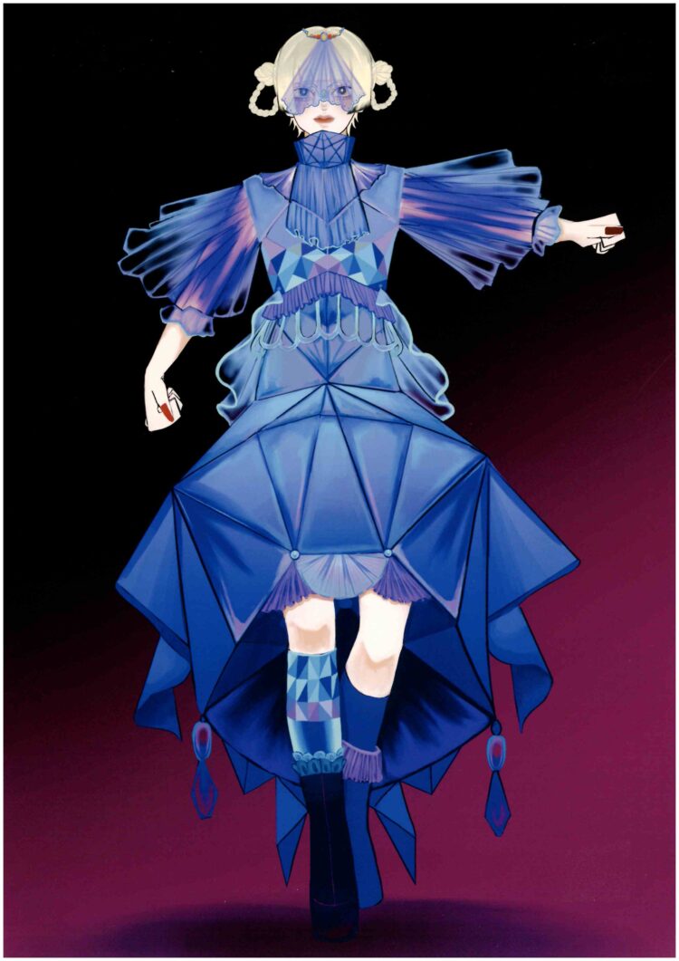 青木規子先生 選評「このデザイン画は男性なのか女性なのか分からないけれど、やさしさと強さの間の微妙なゆらぎがあって、独特の世界観を作っています。服になったときもきっとかわいいでしょうし、作者の“憧れの人”は知らない人だけどすごく似合うんだろうなって思わせる、その説得力がすごく光っていました」