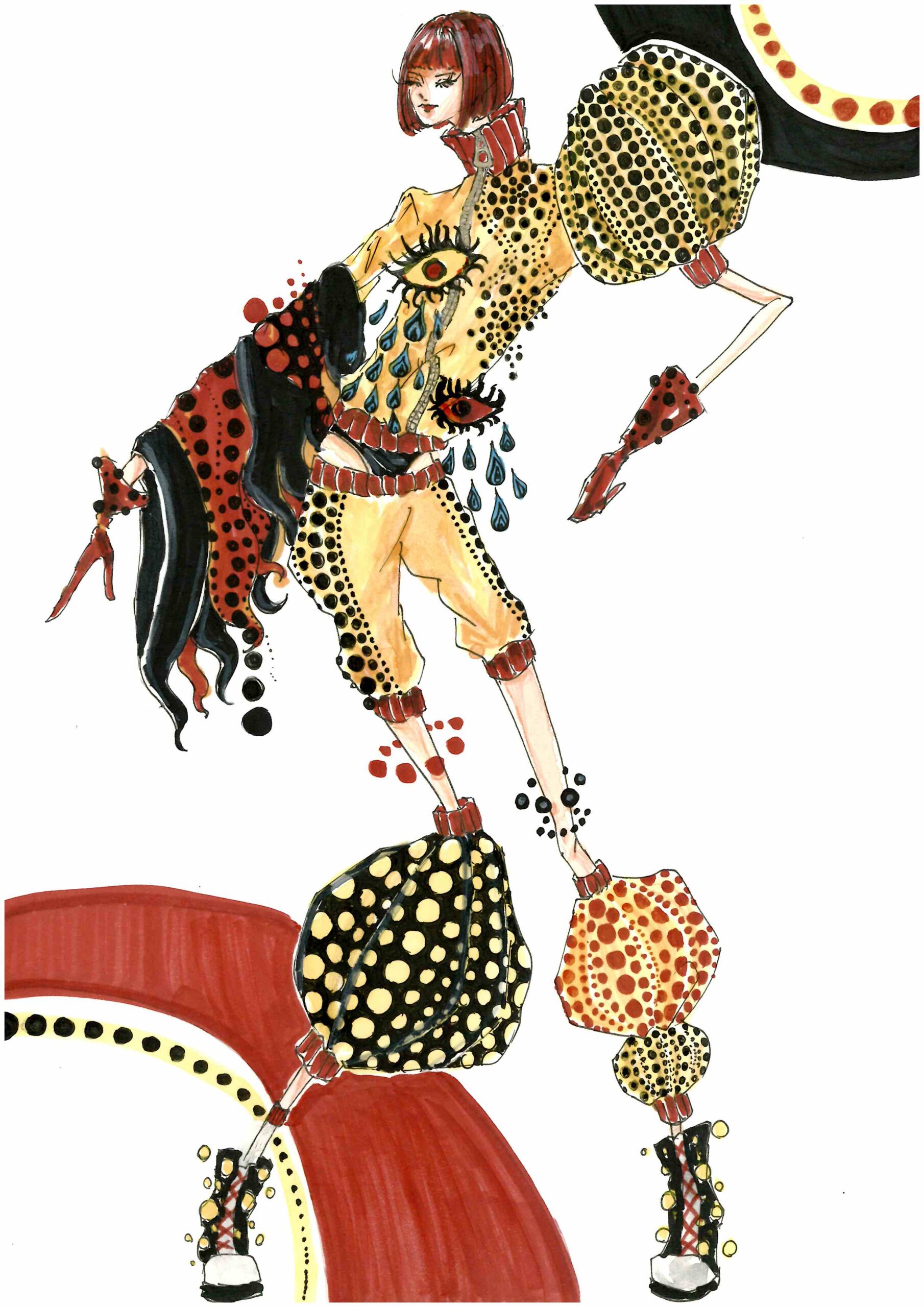 作品説明「憧れのあの人に“着せたい”服というテーマを、憧れの人を作品の中で独占できるという意味として捉えました。それなら、(おこがましいけど)その人に同じ服を着せたい。ペアルックとかの生ぬるいものではなく、コネクト、フュージョンでもなく。先輩、私と作品になってください……そうですね、一体化したい!」 *手塚 迪さんは、昨年の高校生ファッションデザイン画コンテストで佳作を受賞されています。