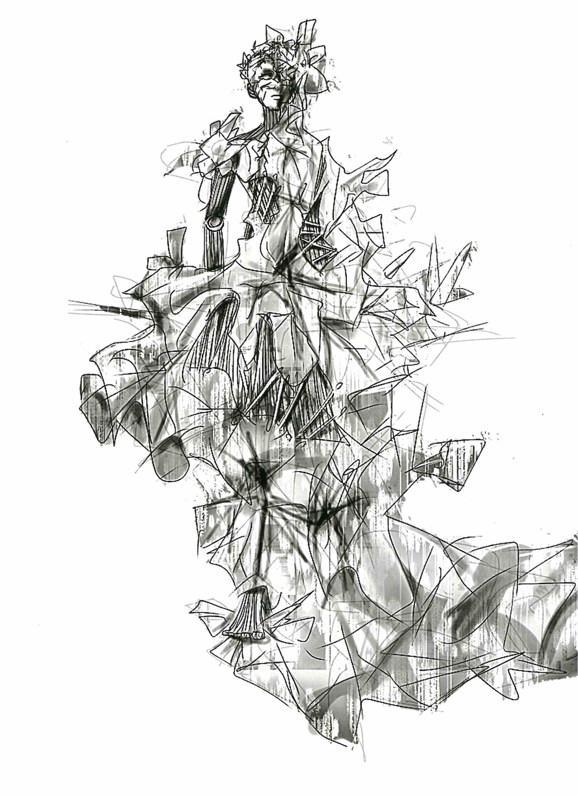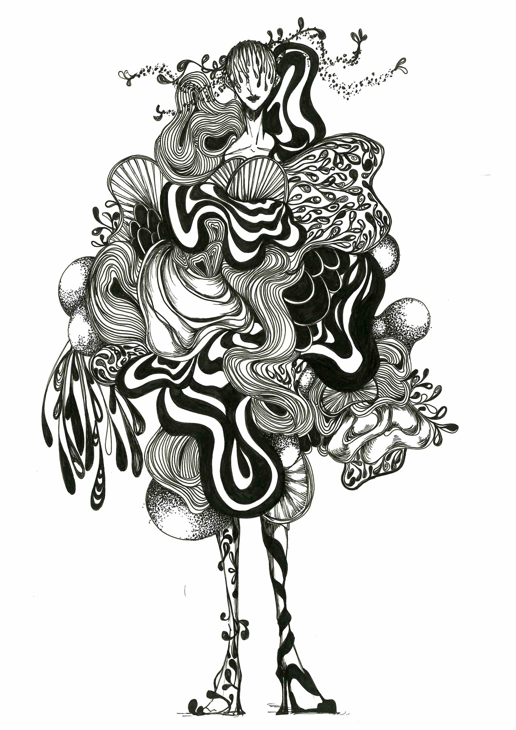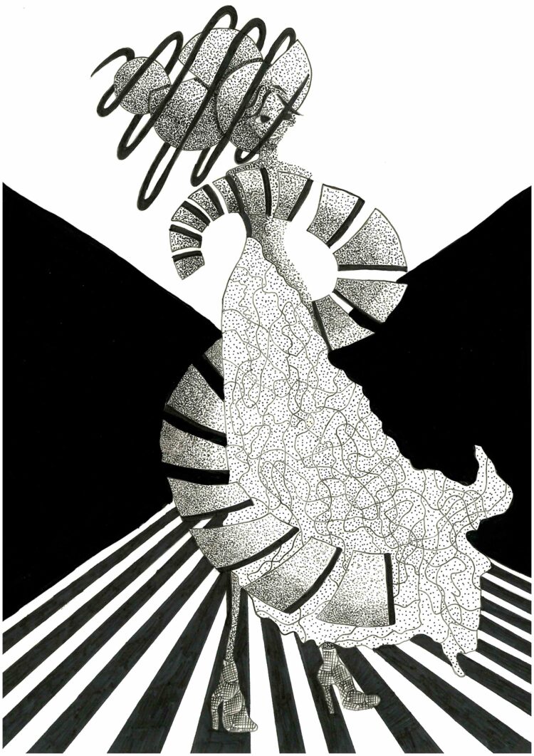 作品説明「制限された世の中で、どれだけ自分というものを表現できるか。クロとシロという色しか使えないという条件が課せられた時、個性の塊である詩羽さんなら自分をどう表現するだろうか。そう考えて描いた作品です。ダリの作品にインスピレーションを得ています」