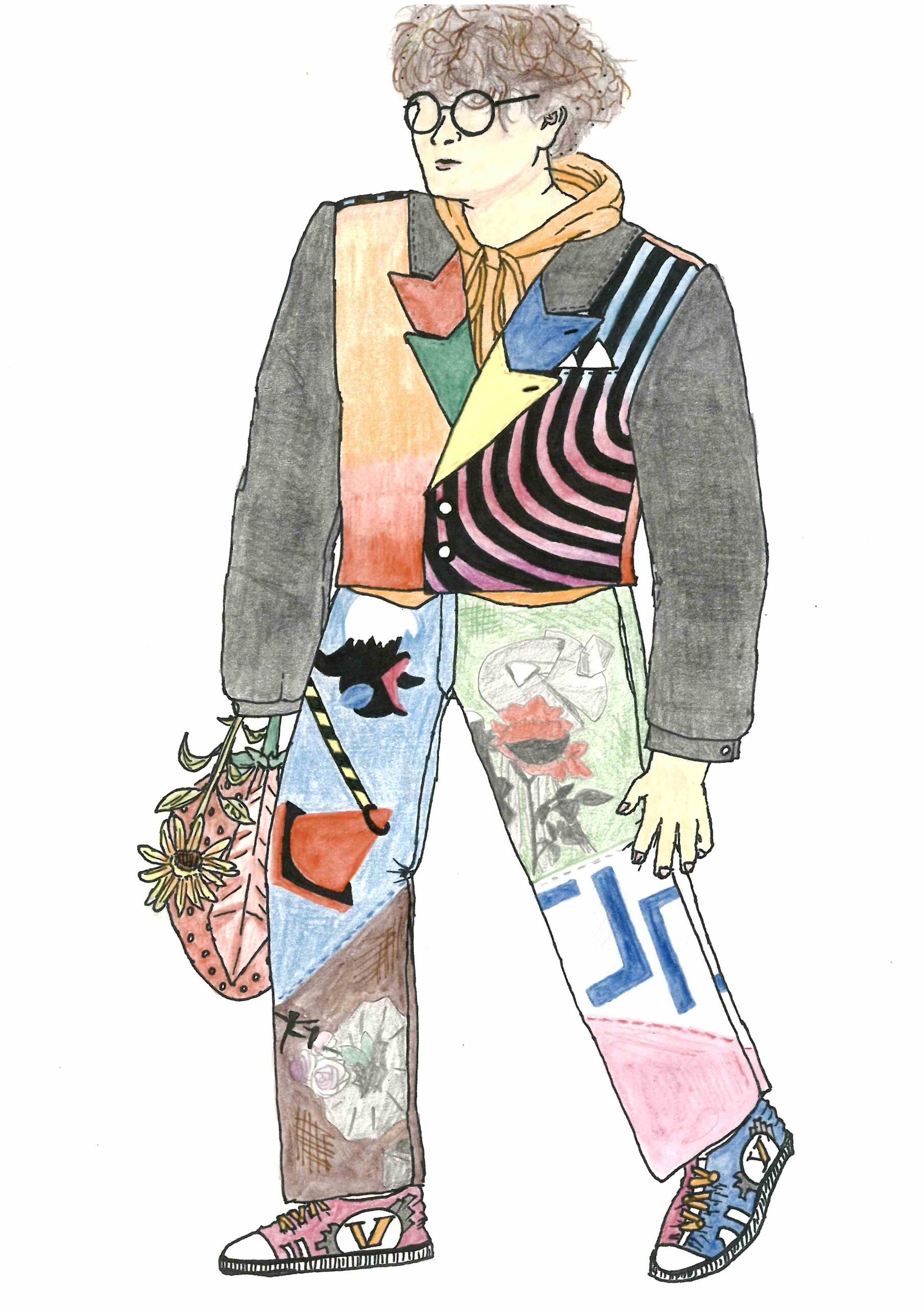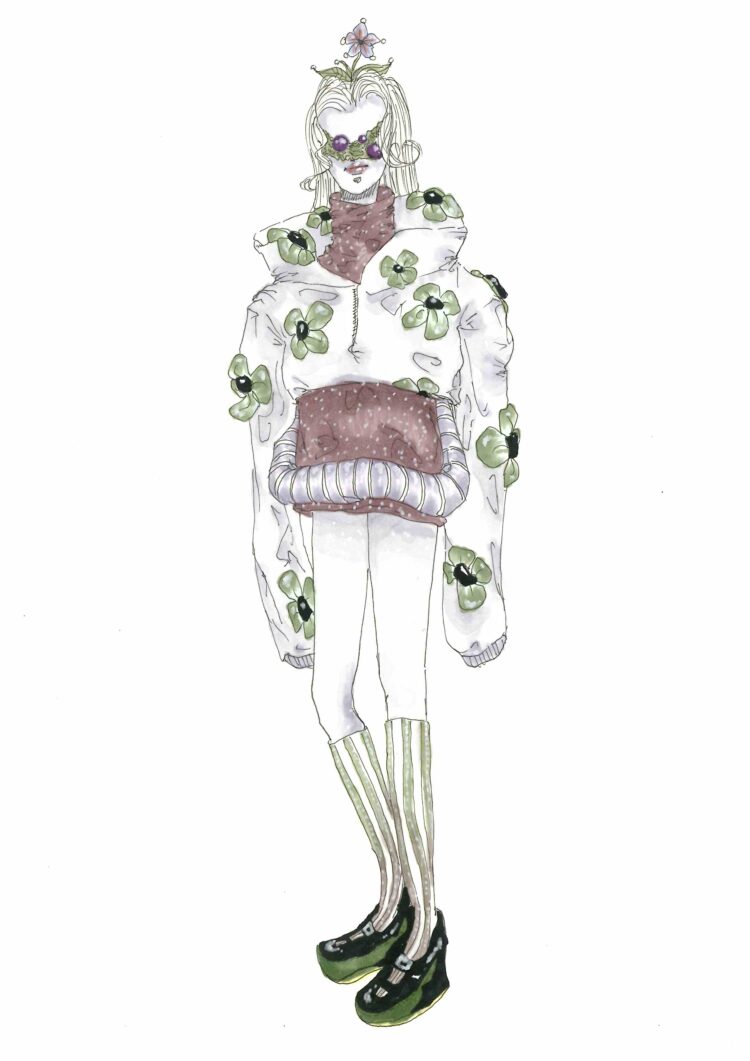 作品説明「この作品は、憧れの大好きな先生に着てもらいたい一着です。その先生は黒ばかり着ていたので、黒以外の色で先生の明るさを表わし、パンツには先生が大好きな花をあしらいました。またディテールの描き込みを控え、抑制をきかせたデザインに仕上げました」