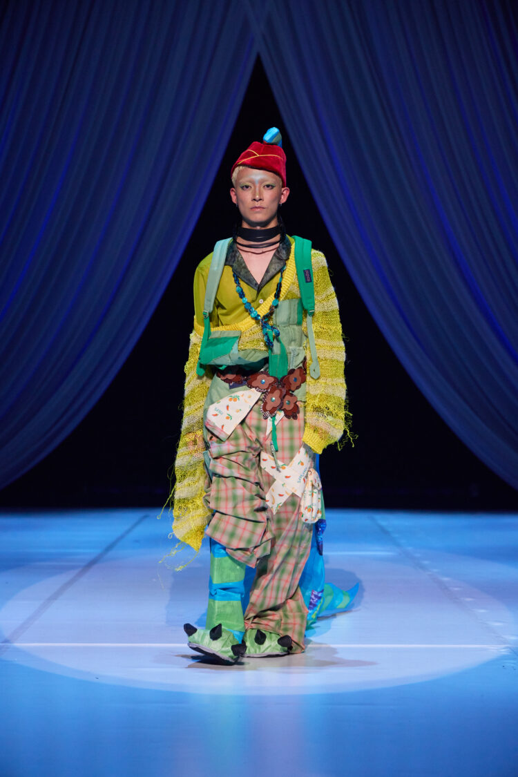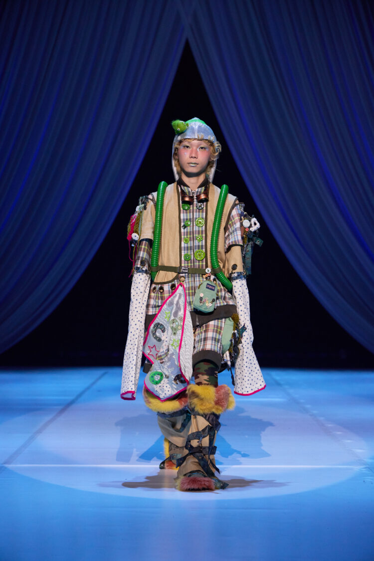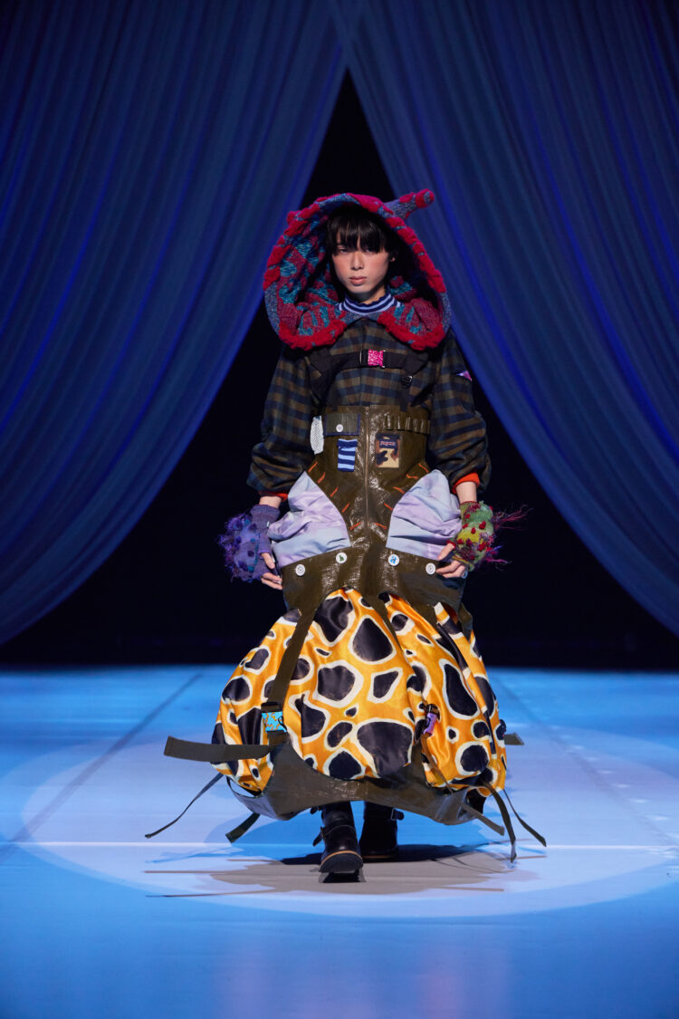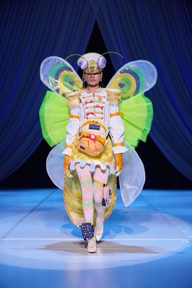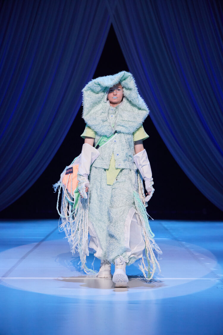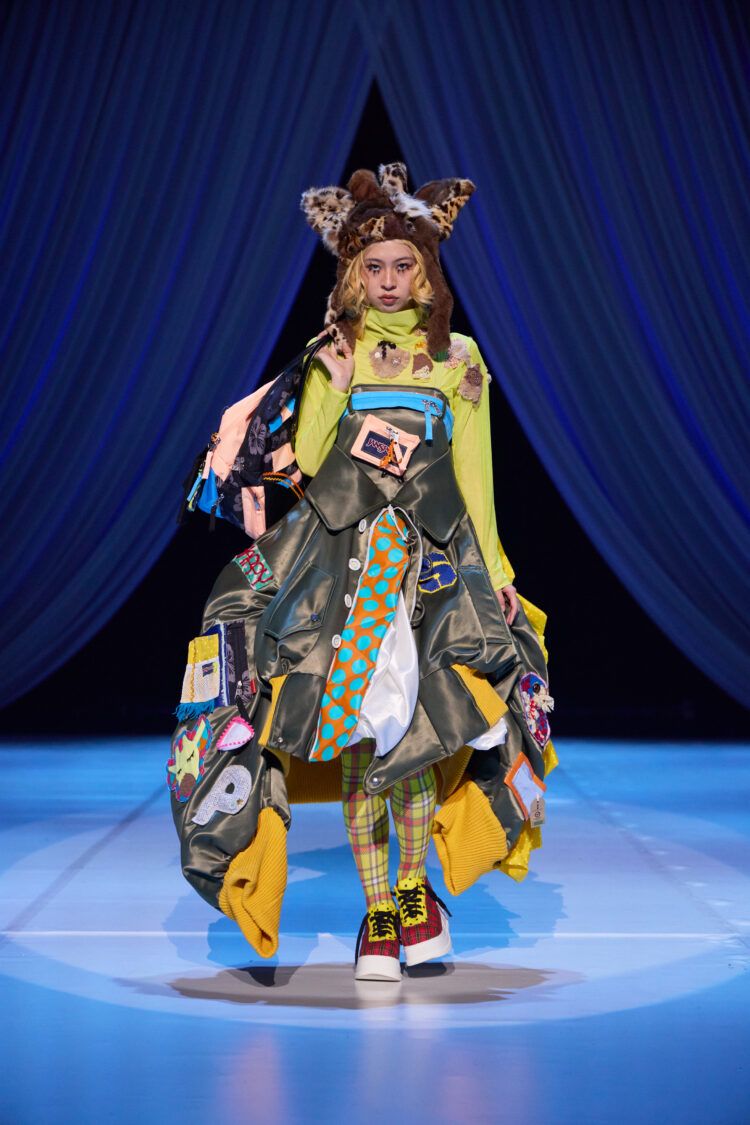 本企画は、JANSPORTの製品をリユース・再構築し、新たなデザインへと昇華させるアップサイクルプロジェクトです。作品は、文化祭ファッションショーを構成するシーンの一つ「happy warriors」にて披露。ブランドが持つ機能性や遊び心あるギミックを活かしながら、学生たちは自由な発想で“未来の幸福なミリタリーファッション”を提案しました。
