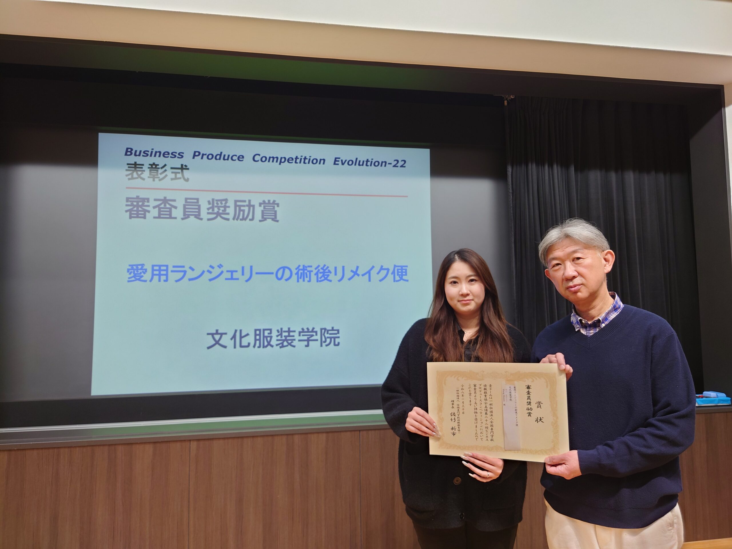 2026年1月30日(金)に専門学校生を対象に実施された第22回ビジネスプロデュースコンペティション(主催:一般社団法人全国専門学校情報教育協会、後援:経済産業省)において、流通高度専門士科2年 ワンスウミンさんのプラン「愛用ランジェリーの術後リメイク便」が審査員奨励賞を受賞しました。
