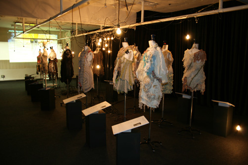 今回の展示では07/08AW・’08SS・08/09AWコレクションワークをお見せします。若干26歳にして日本のみならず海外でも高い評価を得ているデザイナーの、一点一点詩情豊かに大胆かつ繊細に仕上げられた作品の数々、ニットの多彩な表現・テクニックをぜひご覧ください。