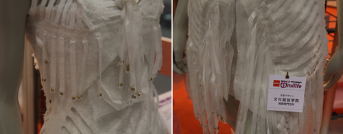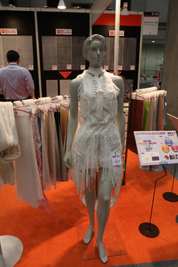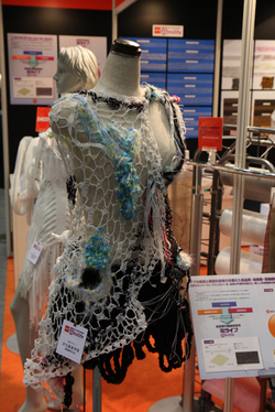 新日石プラスト株式会社が開発した新素材「ミライフ-milife-」の展示ブースにて文化服装学院の高度専門士科が新素材を用いた制作作品を展示。