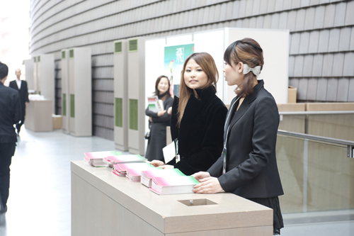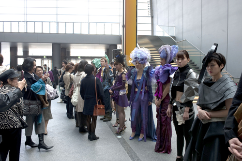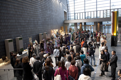 ファッションショー終了後は登場モデルがエントランスホールでお見送り。ここでも作品やモデルの美しさに魅入られるお客さまや撮影する方がたくさん見受けられました。