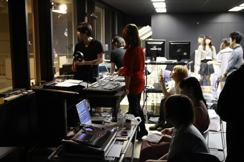 (上)ショーの企画・演出を担当した学生 (下)映像・照明・音効ブースの学生達