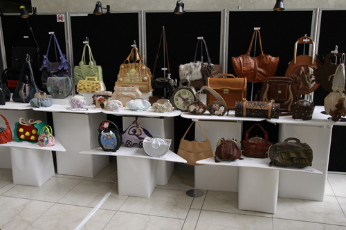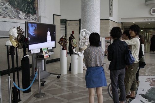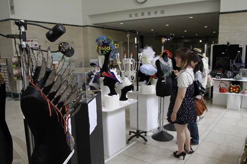 ○エントランスではテキスタイル・帽子・ジュエリー・バッグ・シューズを学ぶファション工芸専門課程の学生作品特別展示も同時開催。工芸課程の教員・学生が作品の解説などを行いました。