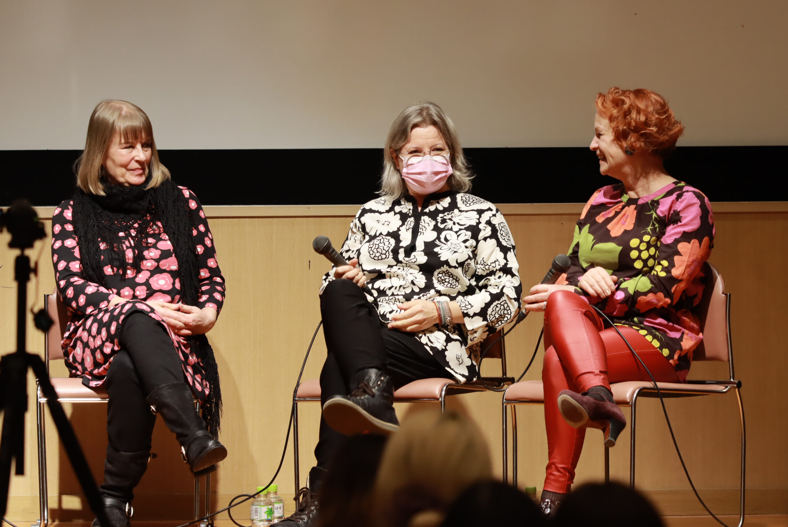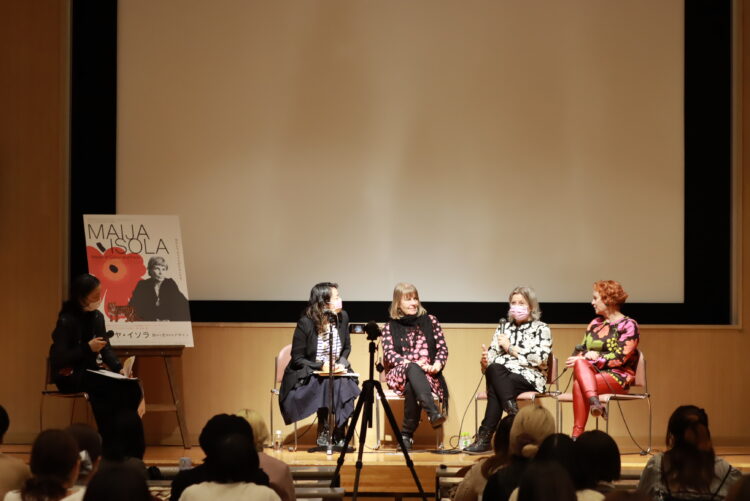 トークショーでは、レーナ・キルペライネン監督、マイヤの孫のエンマ・イソラさん、プロデューサーのメルヤ・リトラさんにご登壇いただき、映画と撮影に関する裏話や、それぞれの立場からみたマイヤの姿、好きなデザインなどをお話しいただきました。
