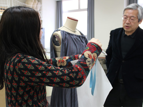 販売される全ての商品は、学生有志がオリジナルでデザインし、高度専門士科の教員や文化服装学院講師の西川真令先生から指導をうけ制作したカットソーを商品化。販売時期や売れ筋の価格帯を考慮のうえ、デザインや素材を決定して商品企画~サンプル制作を行い、企画したデザインに関して一人ひとりアドバイスを頂きました。量産用へのデザイン・パターン修正作業を経て国内工場に製造依頼し商品化されたアイテムが店頭に並びます。