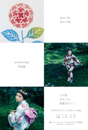 フォトグラファーkatomiとヘアメイクtokitaによるクリエイティブユニットmilky wingsがphro-floの浴衣をアイデアソースにした写真作品とphro-flo2011、2012`sの浴衣を展示します。