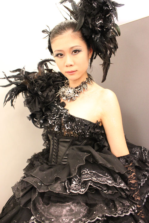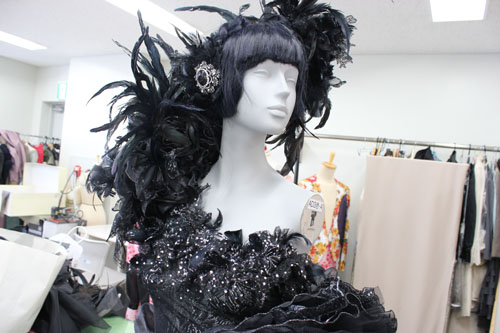 レース、チュール、オーガンジーなどの生地をふんだんに使い、またビーズ、スパンコール、ラメや羽を装飾し黒一色でありながら華やかな衣装となりました。