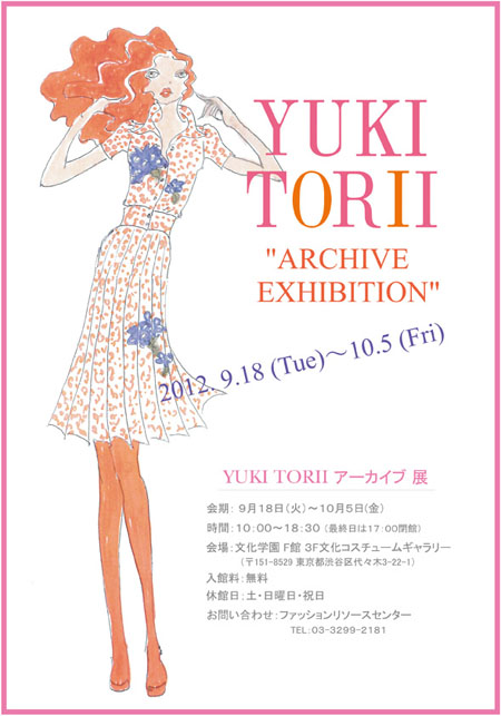 ファッションリソースセンターではYUKI TORII アーカイヴ展を開催しています。 昨年50周年を迎えたデザイナー鳥居ユキの半世紀に渡る活動の記録を デビュー当時の貴重なパネルや写真を中心に展示します。ぜひ、ご覧ください。 会期 2012.9.18(火)?10.5(金)土・日・祝 休み 時間 10:00?18:30(最終日17:00) 会場 文化コスチュームギャラリー(F館3F) 問合せ ファッションリソースセンター 03-3299-2181 ※入場無料