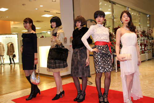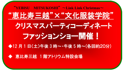 恵比寿三越2012クリスマステーマは「Link Link Christmas」(リンクリンククリスマス)。LINK(リンク) = 人とのつながりを大切に、共有する、絆を深める。テーマに沿ったイベントの一つとして、恵比寿三越のファッションブランドと文化服装学院の学生とのコラボレーションで、クリスマスのパーティシーンに映えるコーディートを紹介するファッションショーを開催しました。