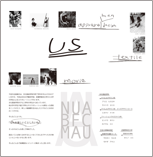 アパレルデザイン科、アパレルデザイン科メンズデザインコース、テキスタイル科の学生を主体として、武蔵野美術大学、日本大学藝術学部との